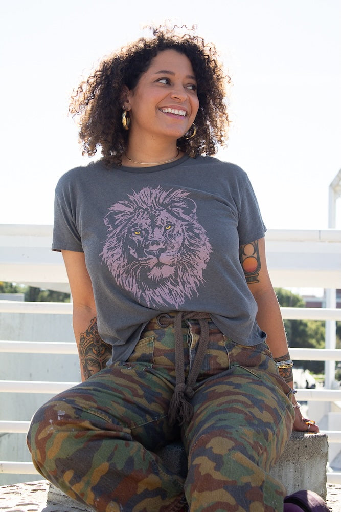 Our "Mane Energy" tee is pure rock and roll - big mane, bold spirit, and just the right flash of yellow in the eyes. Printed in a perfectly faded mauve ink on our vintage black tee, this one’s made to headline your closet!